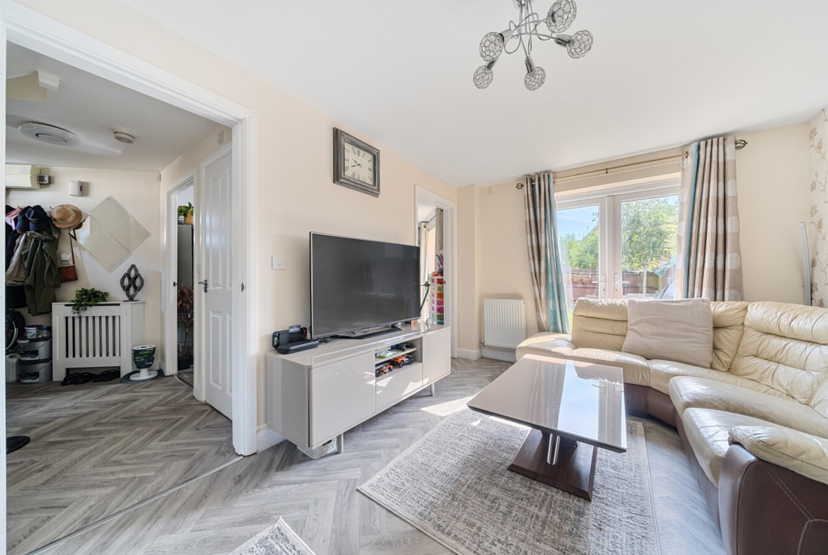 To the front, tandem parking provides ample space to the side of the home. Step inside to a welcoming entrance hallway leading to a bright and spacious kitchen-diner on one side, complete with patio doors that open directly onto the garden—perfect for indoor-outdoor living. On the other side, the generous lounge also features garden access, creating a light-filled, open feel throughout the ground floor.
