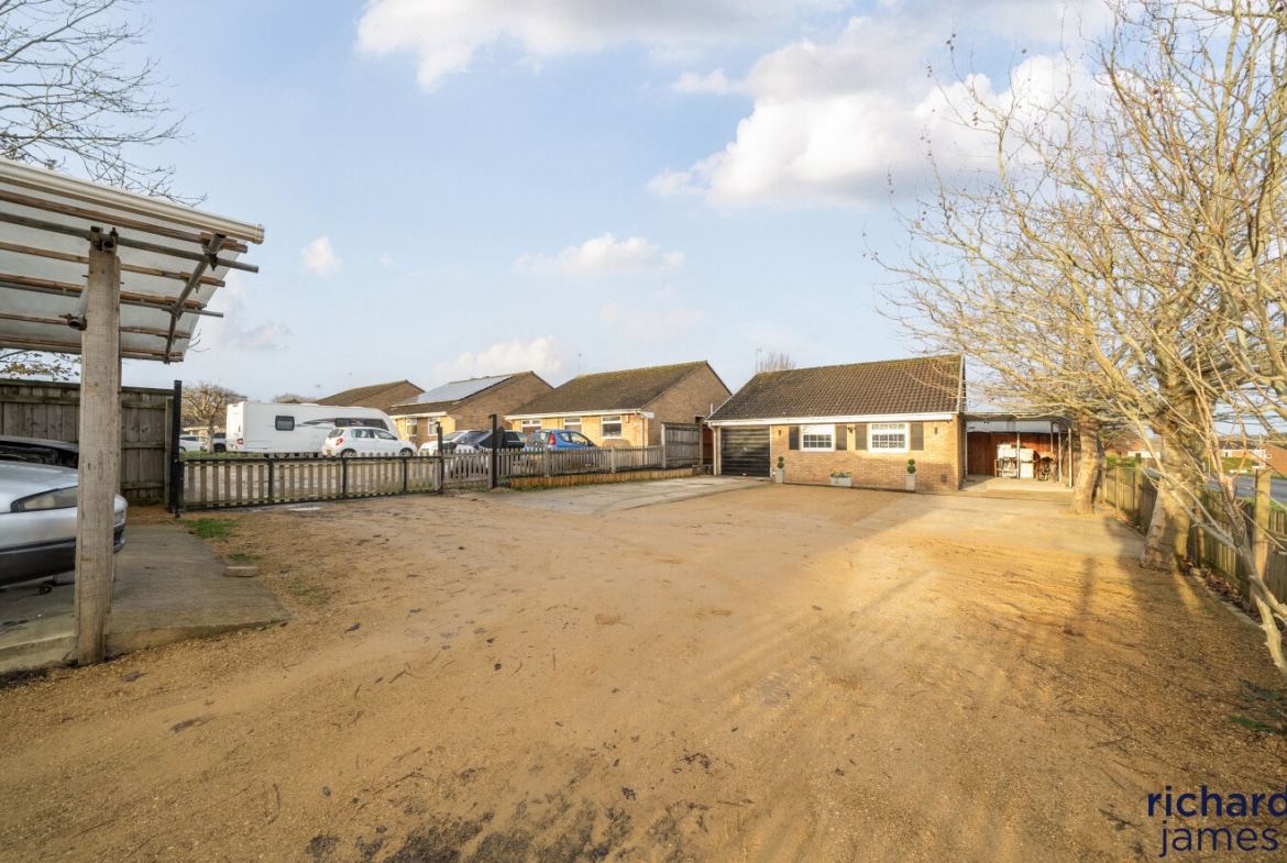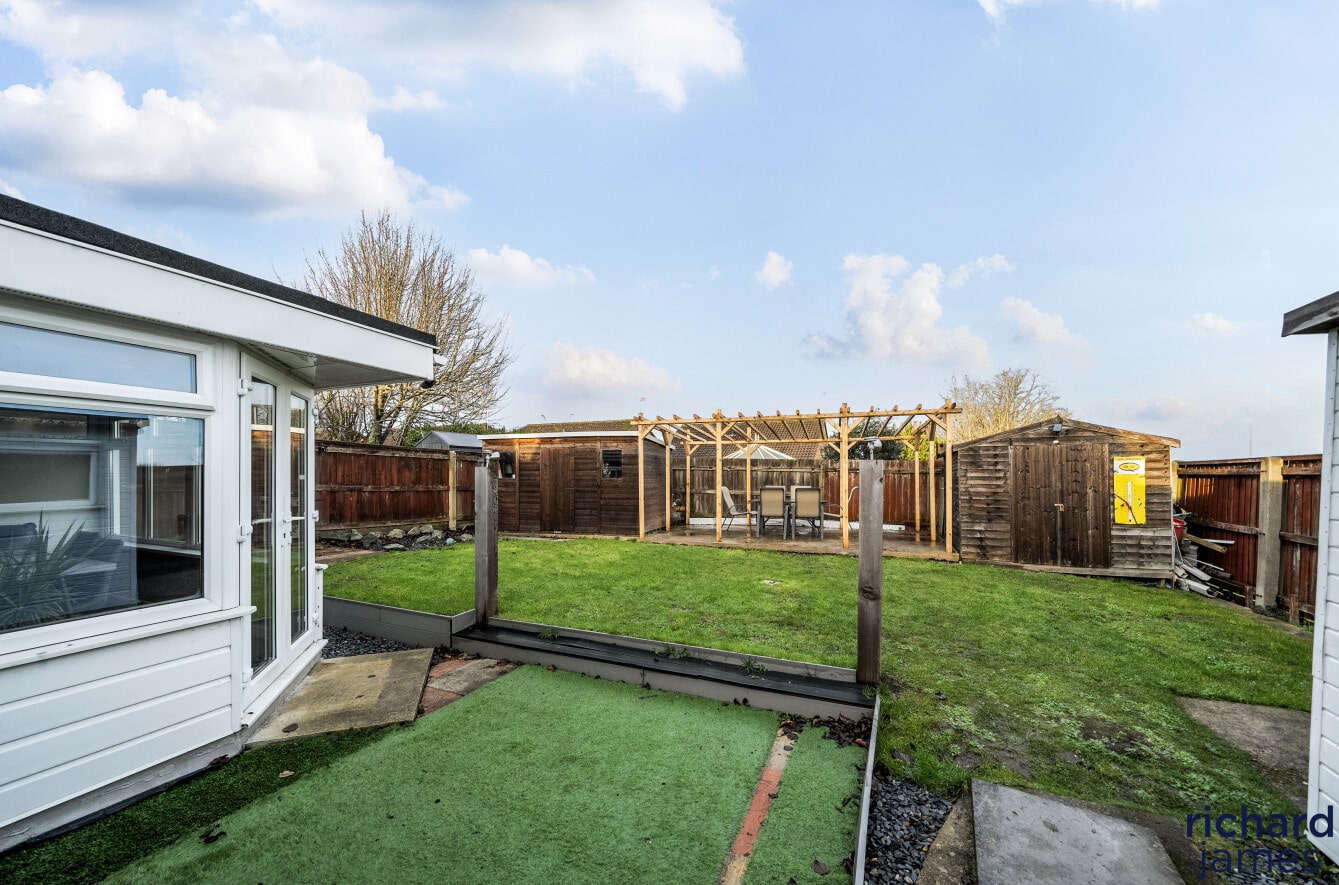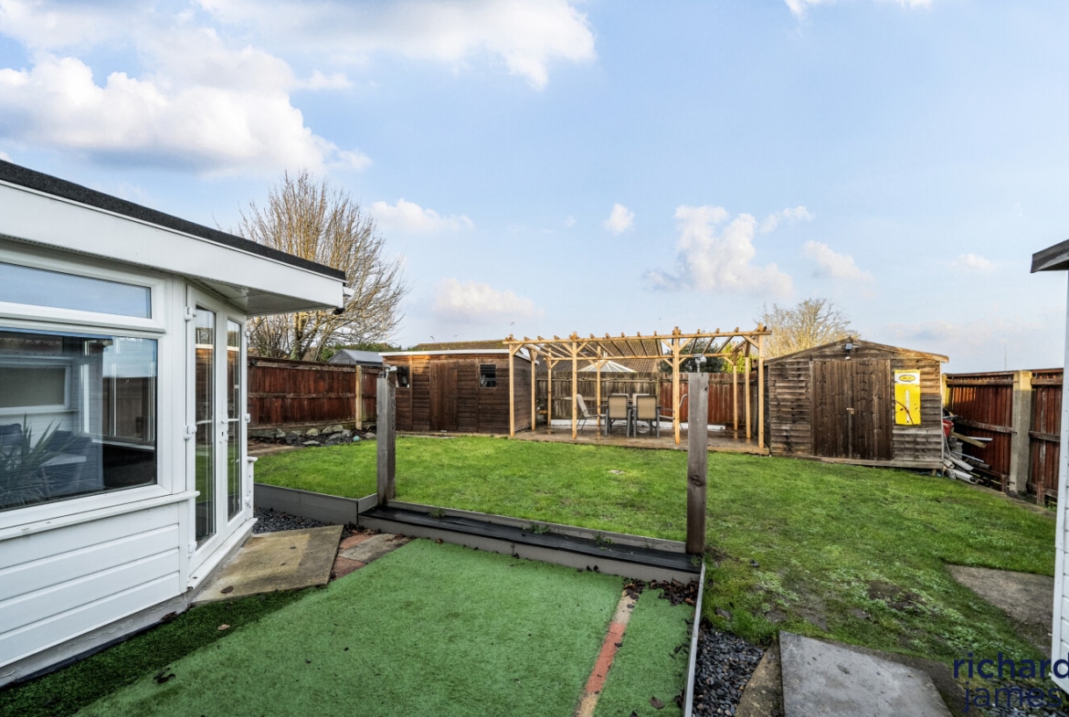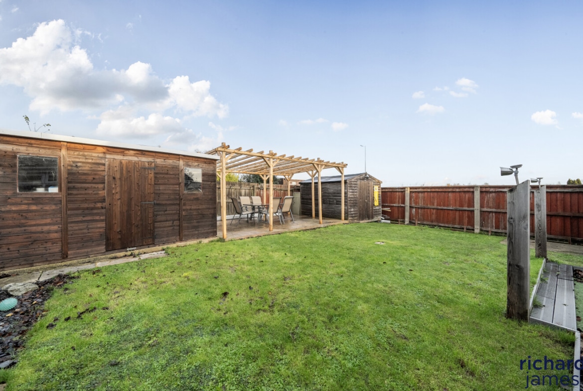 Externally, the property is just as impressive, offering ample parking solutions with a garage, two separate carports, and a generously sized enclosed driveway/front garden capable of accommodating several vehicles. The enclosed rear garden is predominantly laid to lawn, providing a safe and enjoyable outdoor space. A seating area with a lovely pagoda within the garden offers a tranquil spot for al fresco dining or relaxing with a good book. Additionally, the garden is complete with an insulated shed with potential as a home office and two further practical sheds, ideal for storage of gardening tools and outdoor equipment.