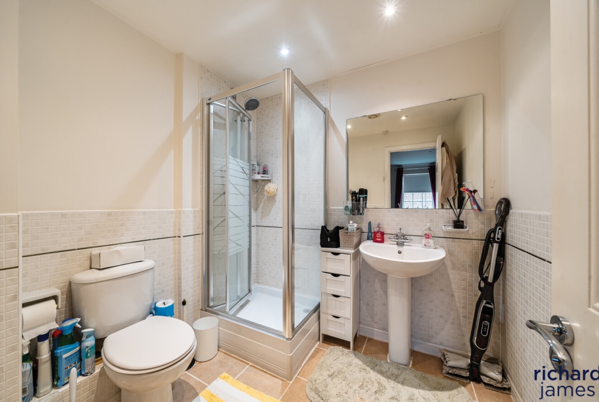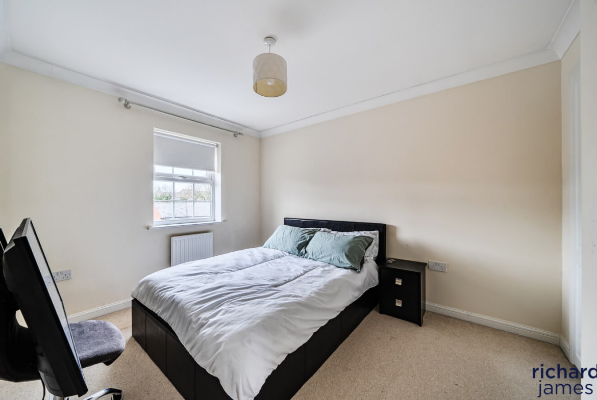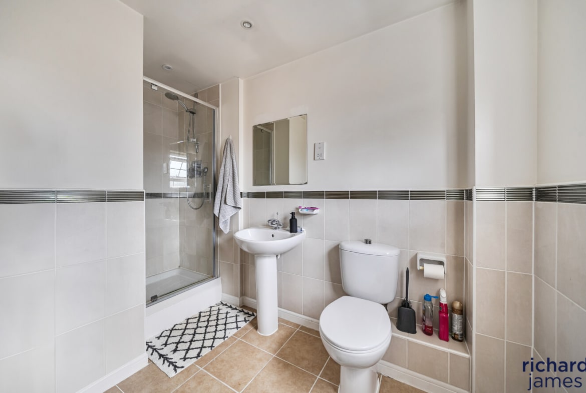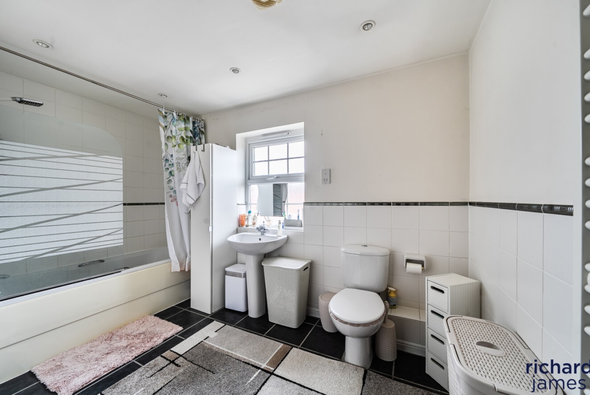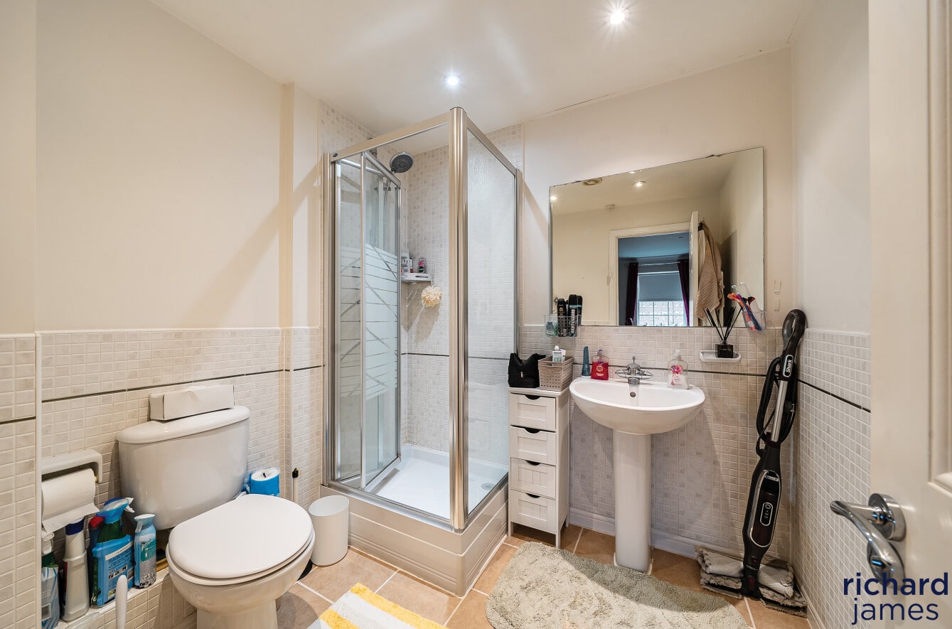 The top floor comprises three further bedrooms, each featuring fitted wardrobes. The principal bedroom also enjoys its own en‑suite shower room, adding convenience and privacy. Bedrooms Two and Three are both excellent doubles and are served by an additional modern family bathroom.