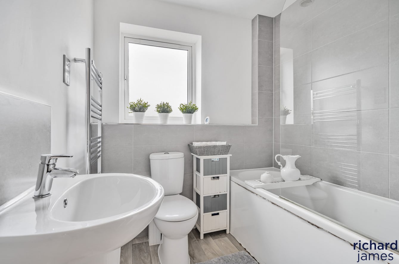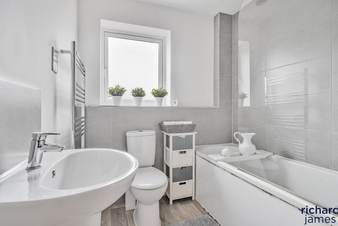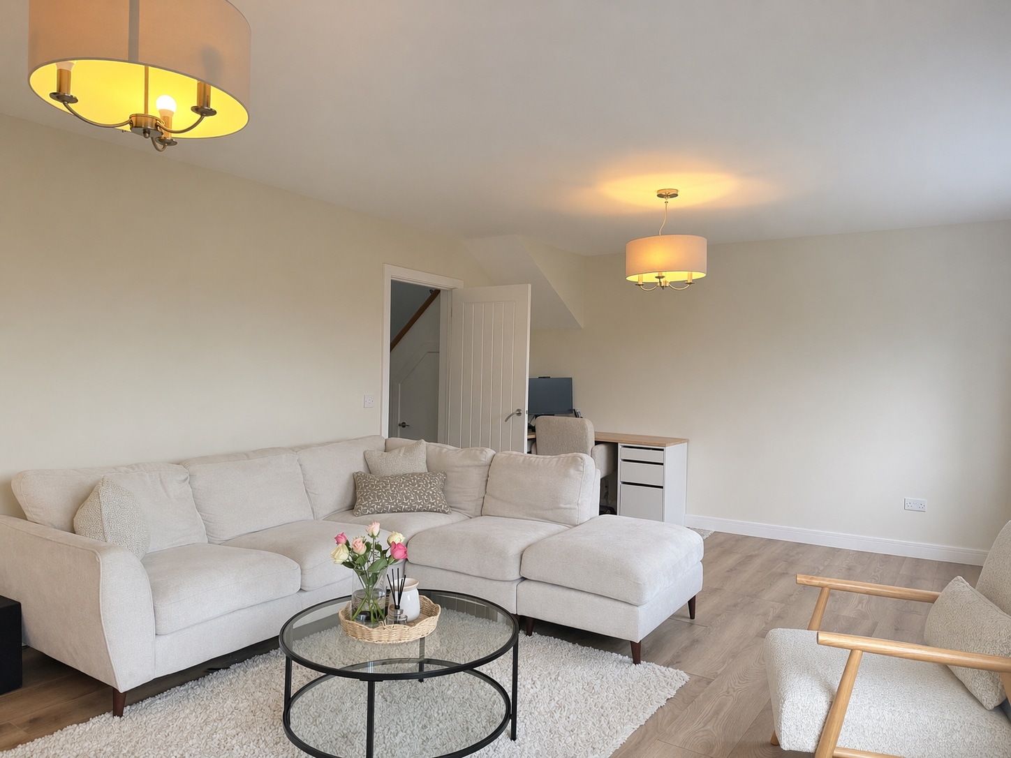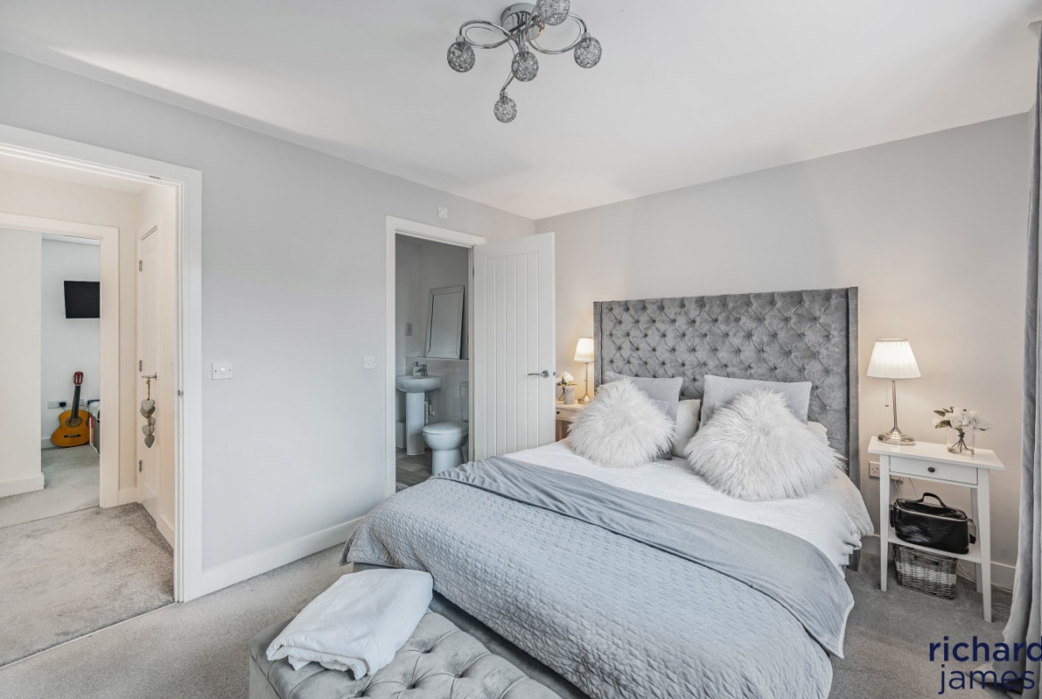 The well-balanced accommodation briefly comprises three bedrooms, including a spacious principal bedroom with ensuite, a contemporary fitted family bathroom, and a bright, airy landing. To the ground floor, there is a welcoming entrance hall, cloakroom, an impressive dual-aspect 22ft living room featuring a stylish built-in media wall, and a modern kitchen/dining room fitted with a range of integrated appliances—perfect for both everyday living and entertaining.