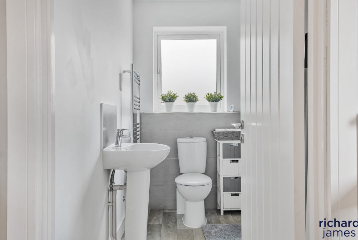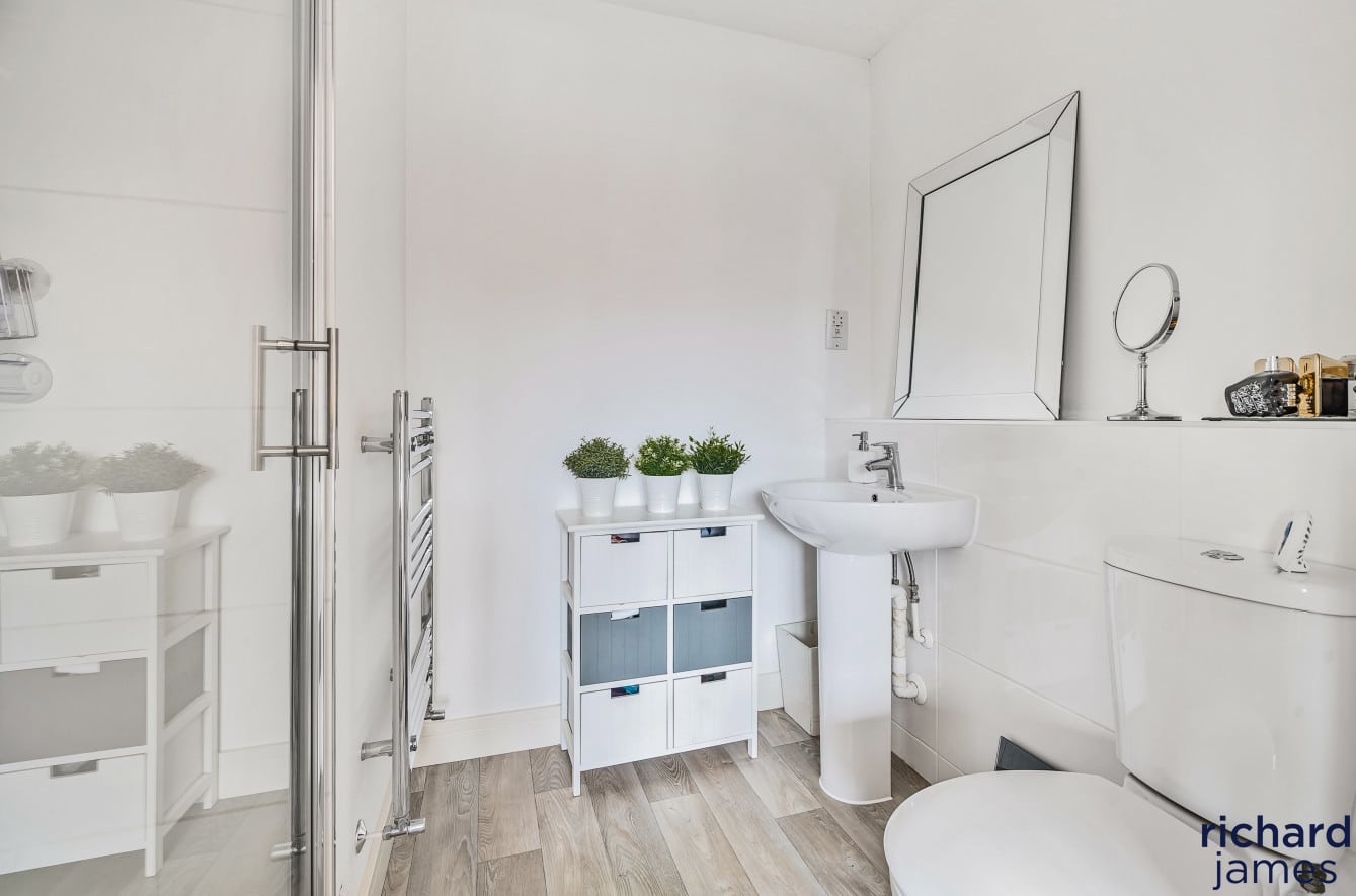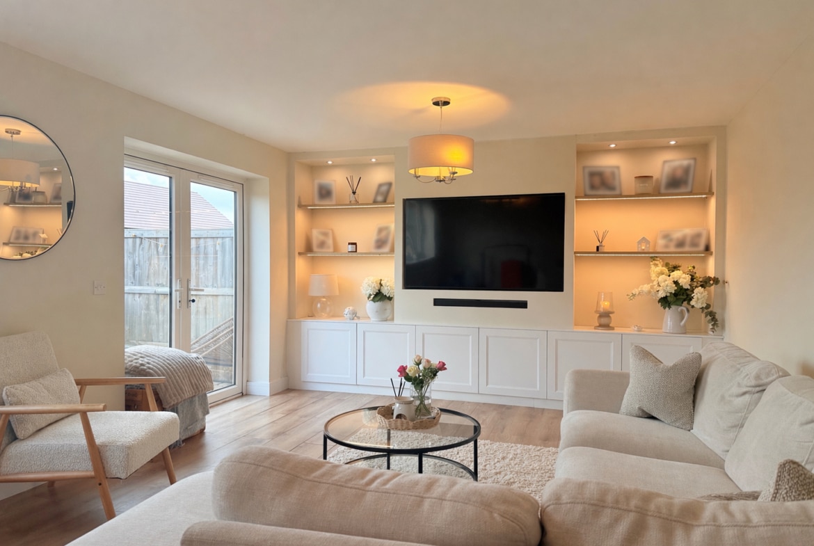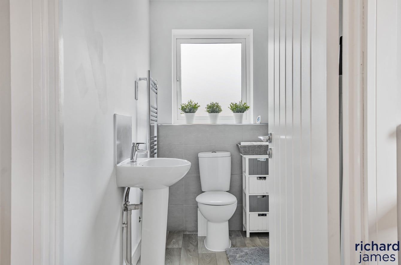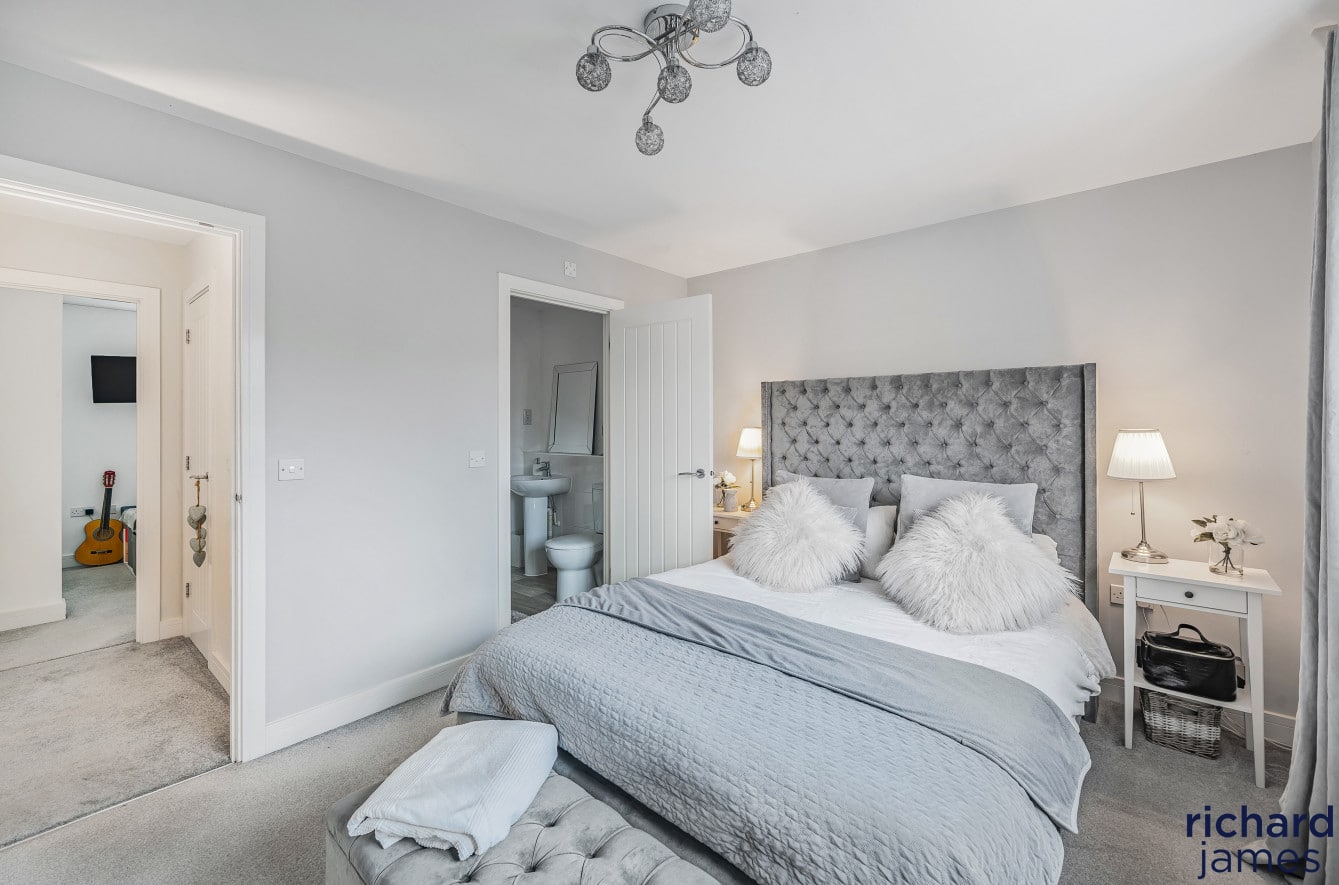 The well-balanced accommodation briefly comprises three bedrooms, including a spacious principal bedroom with ensuite, a contemporary fitted family bathroom, and a bright, airy landing. To the ground floor, there is a welcoming entrance hall, cloakroom, an impressive dual-aspect 22ft living room featuring a stylish built-in media wall, and a modern kitchen/dining room fitted with a range of integrated appliances—perfect for both everyday living and entertaining.
