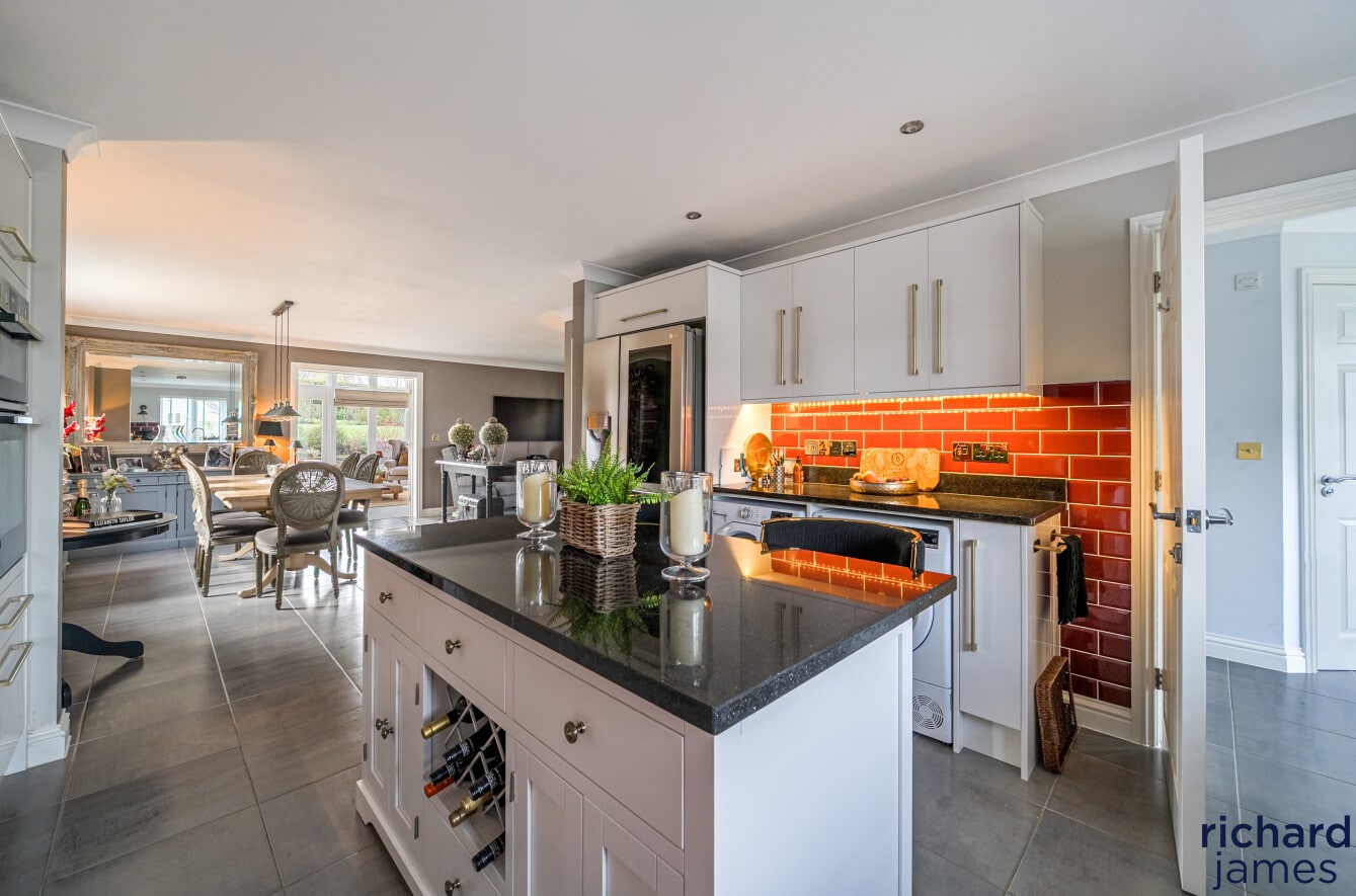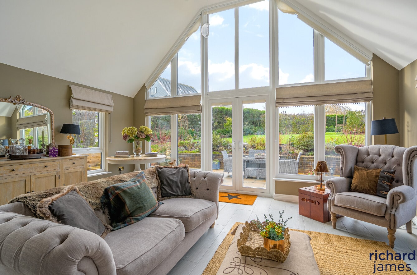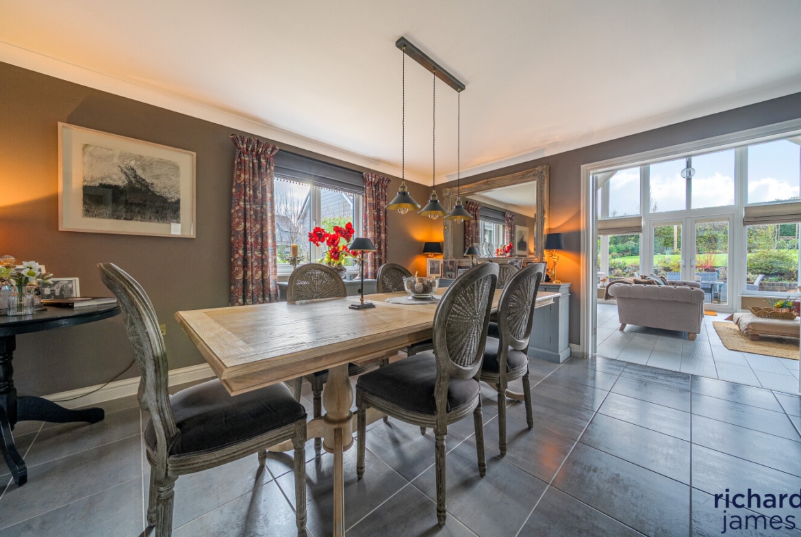 At the heart of the home lies an impressive, open-plan kitchen, dining and living space—perfect for everyday living and relaxed entertaining. The kitchen features contemporary cabinetry, quality integrated appliances and a seamless flow into the sociable dining/living area. To the rear, the spectacular garden room steals the show: soaring ceilings, dramatic glazing and French doors frame serene views across the landscaped garden, creating a peaceful year-round retreat bathed in natural light.