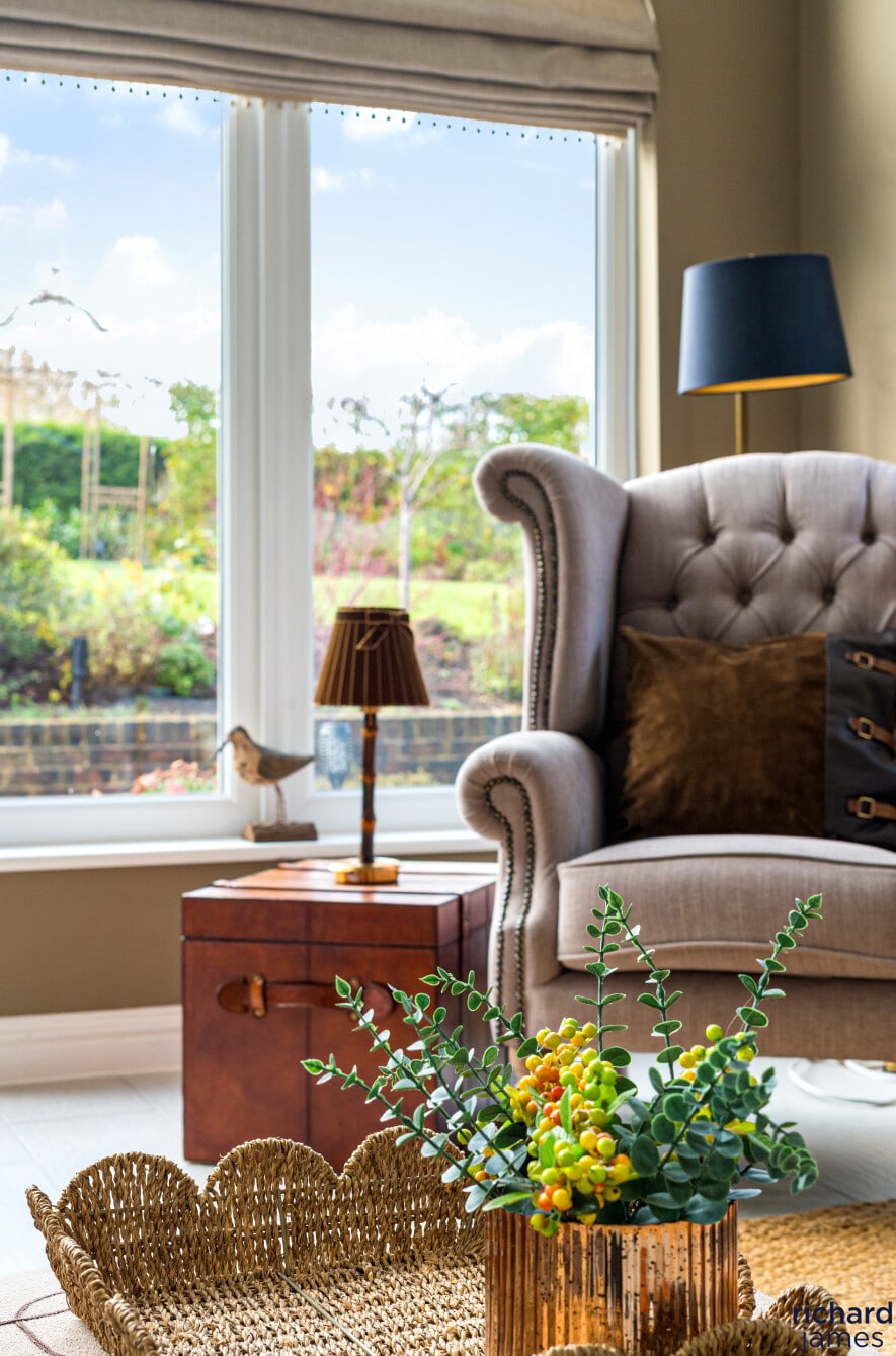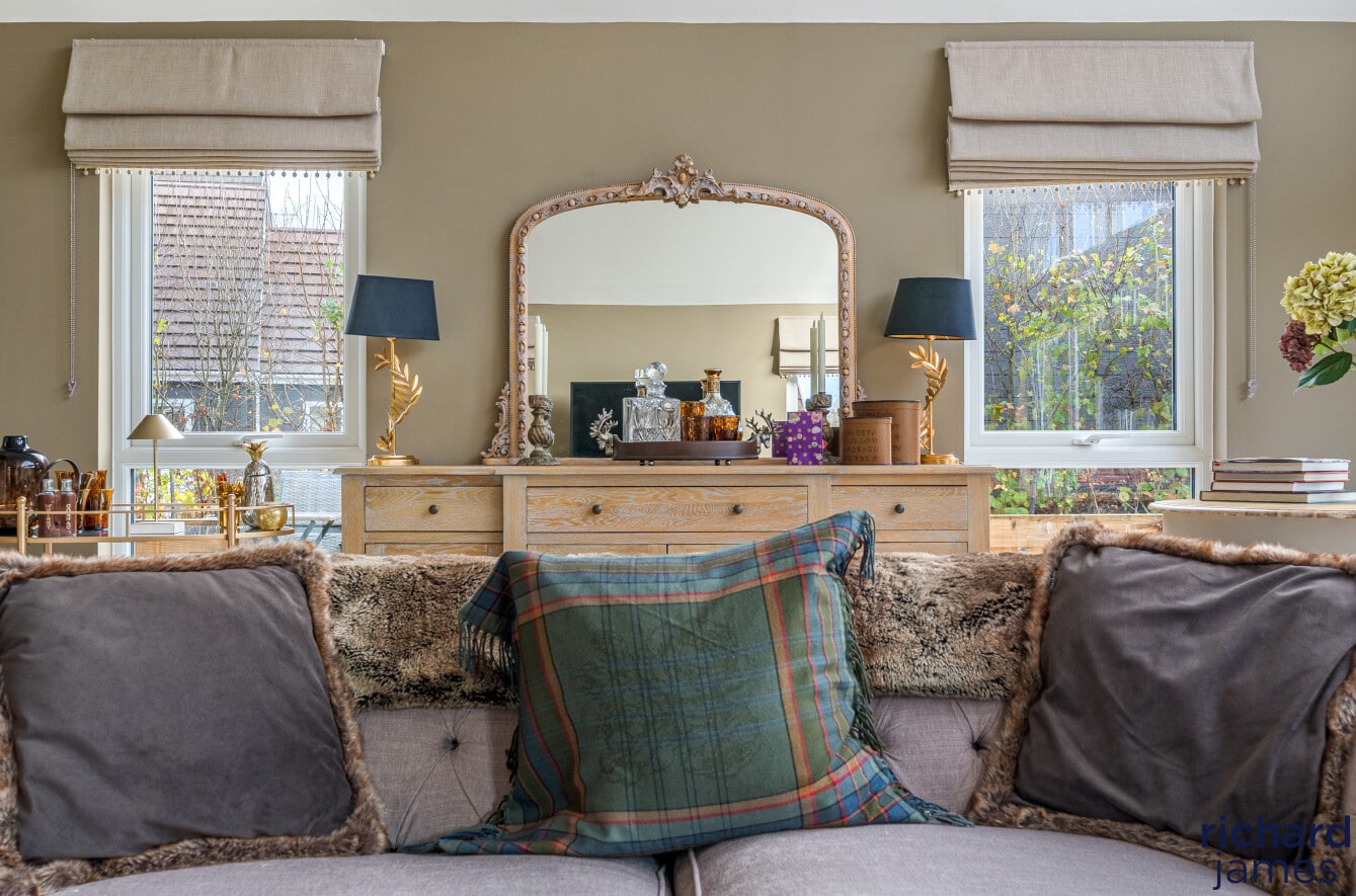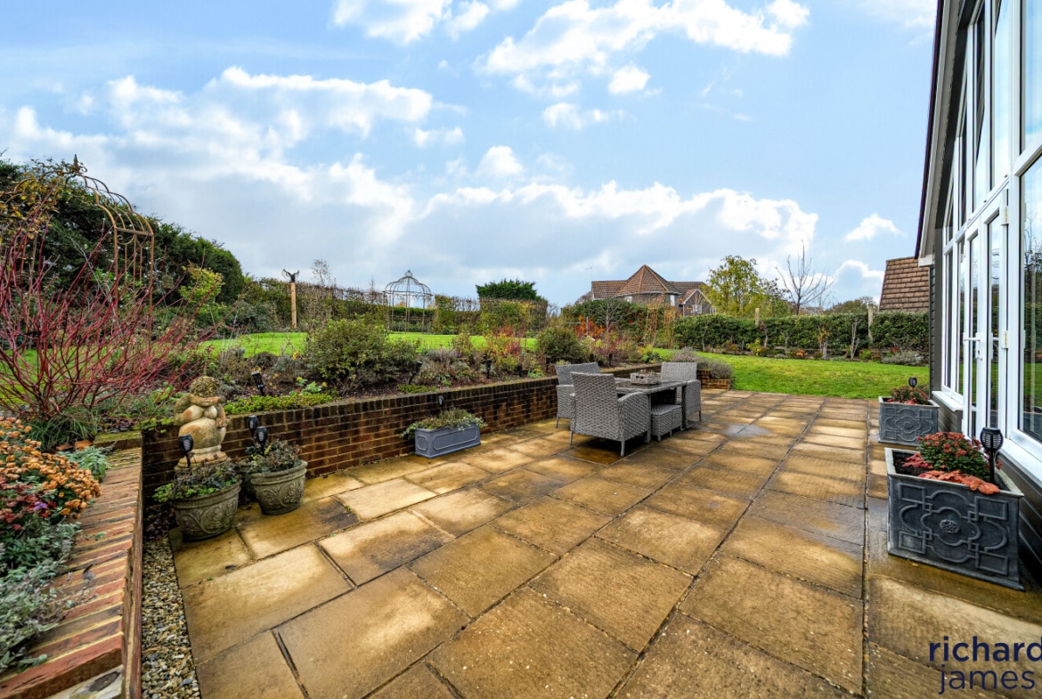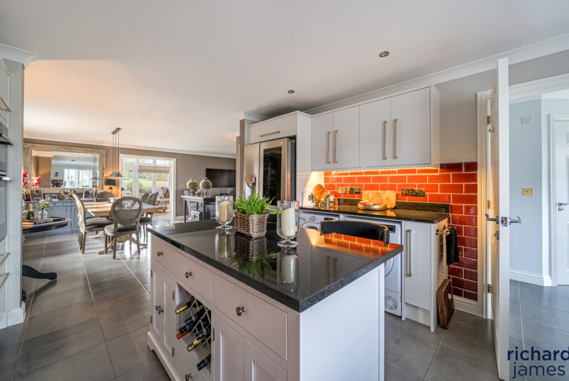 At the heart of the home lies an impressive, open-plan kitchen, dining and living space—perfect for everyday living and relaxed entertaining. The kitchen features contemporary cabinetry, quality integrated appliances and a seamless flow into the sociable dining/living area. To the rear, the spectacular garden room steals the show: soaring ceilings, dramatic glazing and French doors frame serene views across the landscaped garden, creating a peaceful year-round retreat bathed in natural light.