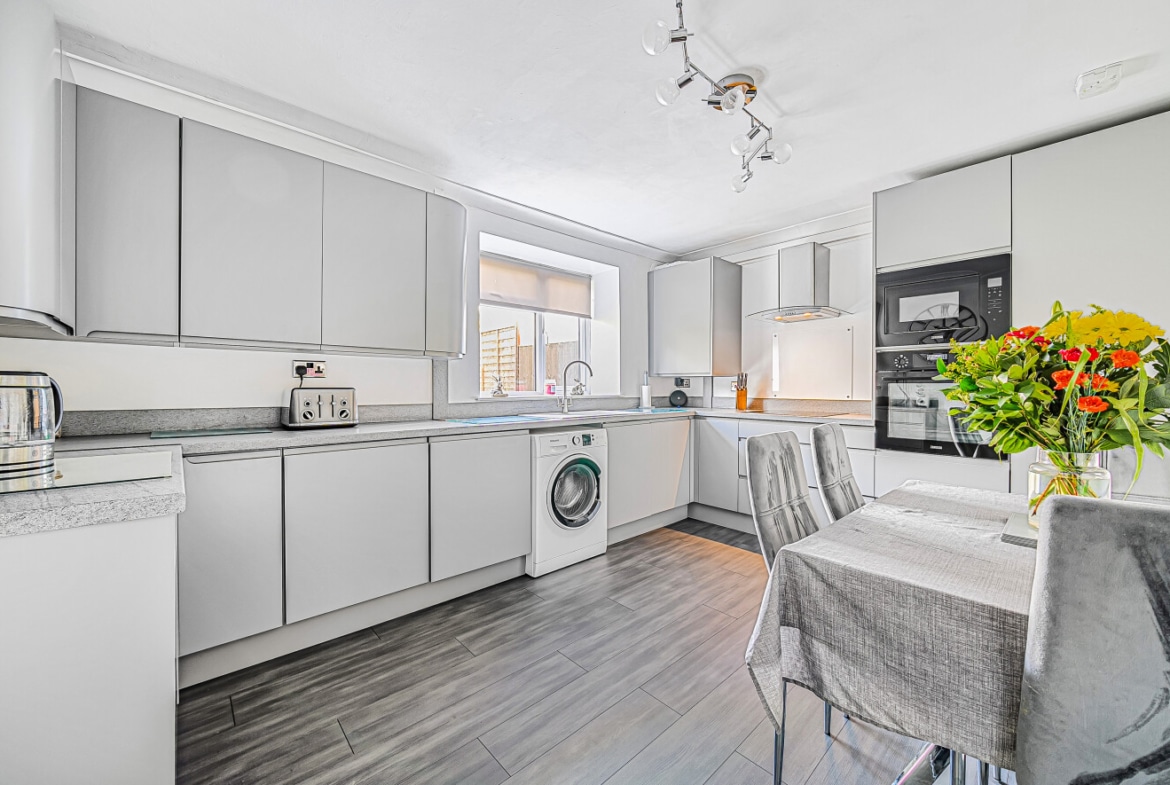 The house opens into a welcoming entrance hall with stairs rising to the first floor and access through to the main reception room. The sitting room is a comfortable and well-proportioned space, filled with natural light and easily arranged around both living and dining furniture. To the rear, the kitchen has been modernised and finished in a clean, contemporary style with sleek units, integrated appliances and ample worktop space. It comfortably accommodates a dining table and enjoys a pleasant outlook over the garden, with direct access outside, making it a great everyday space as well as one that works well for entertaining. A useful utility area and ground floor WC add further practicality.