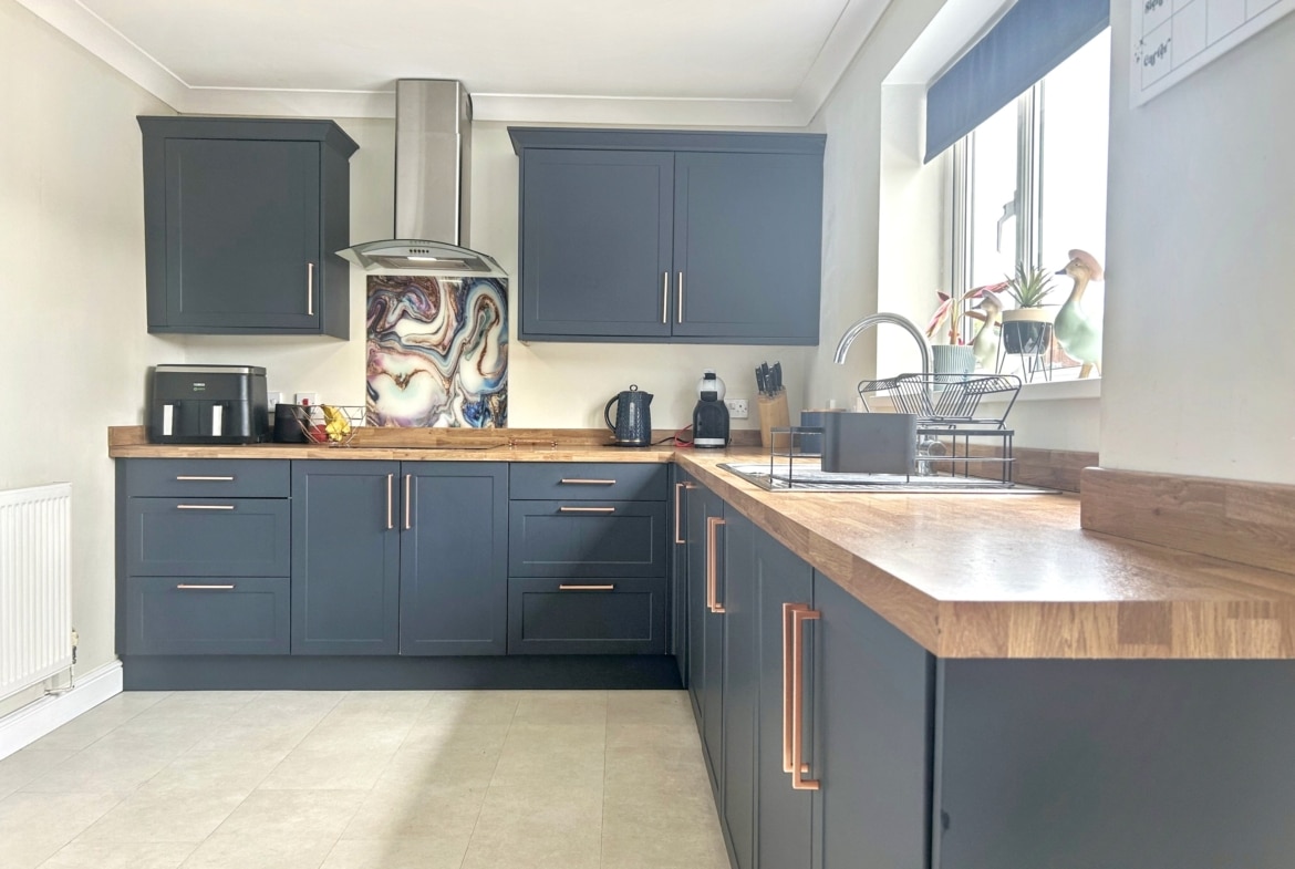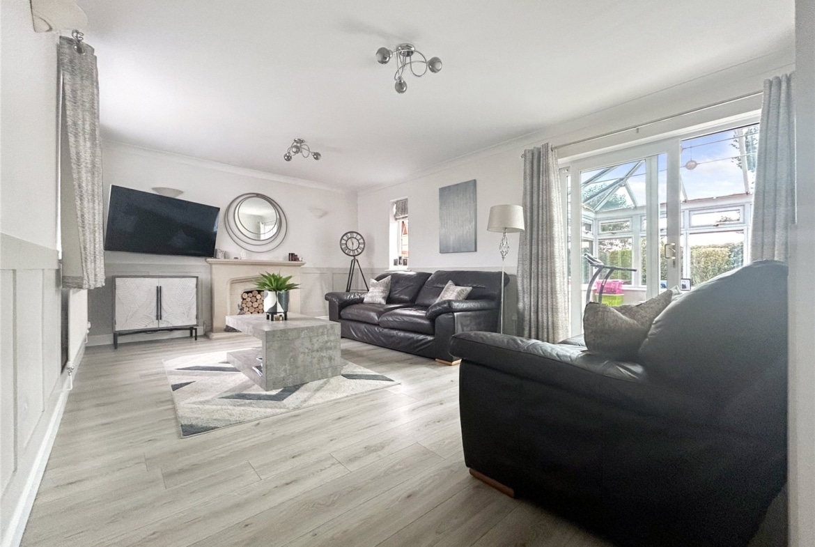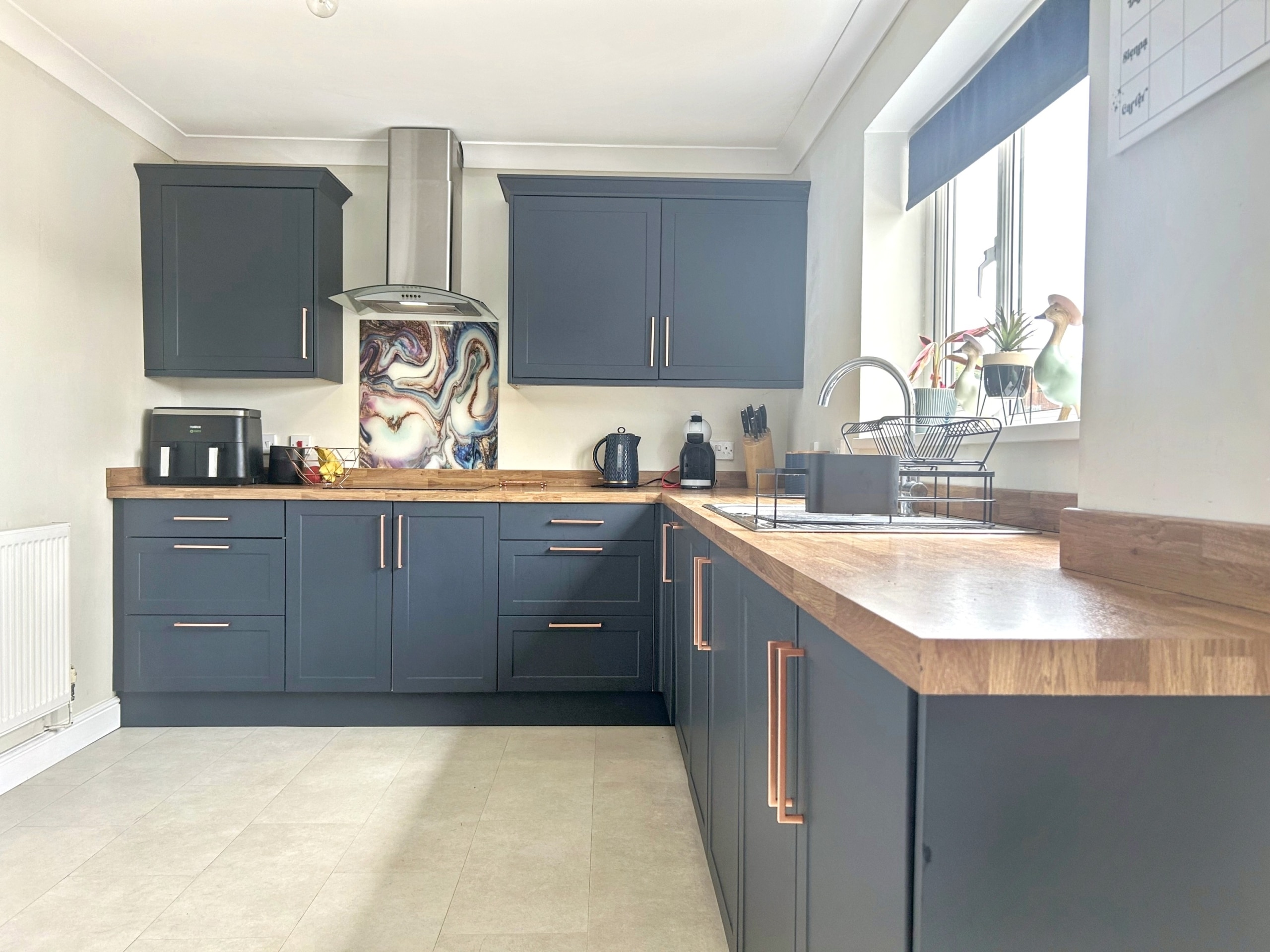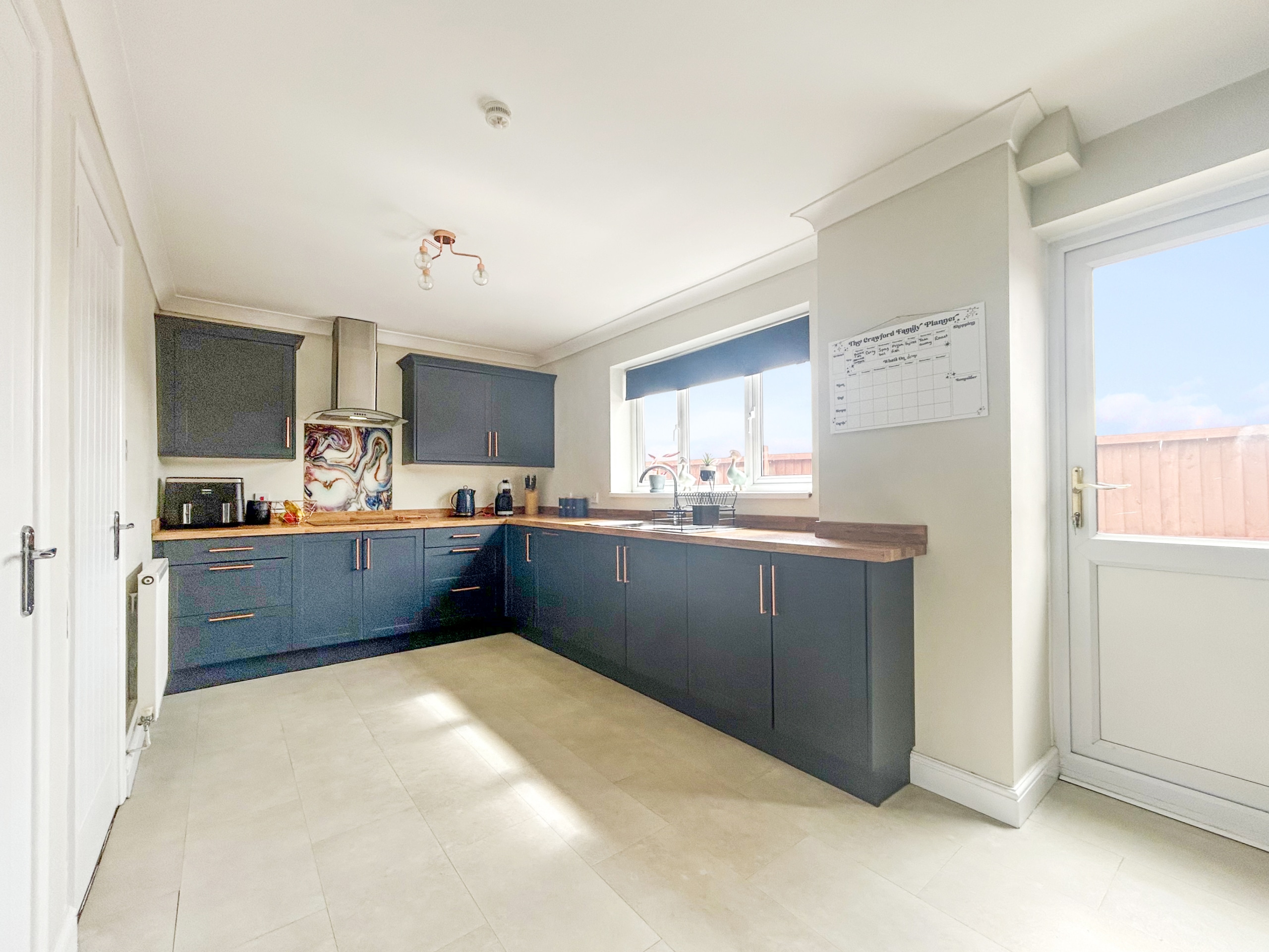 Upon entering the property, you are welcomed by a generous hallway that leads into the main living areas. The living room is a bright and inviting space, with ample room for relaxing and entertaining. Large windows allow natural light to flood in, and a feature fireplace adds a cozy ambiance, perfect for those cooler evenings. French doors open into a well-proportioned conservatory, offering additional space for enjoying the garden views throughout the year. The conservatory could serve as a second sitting room or even a playroom, providing flexibility for growing families.The heart of the home is the newly fitted kitchen, designed with a range of contemporary midnight blue shaker style units. This stunning kitchen boasts ample storage and high-quality integrated appliances, including a built-in oven, hob, dishwasher and fridge-freezer, creating an ideal space for cooking and family dining.