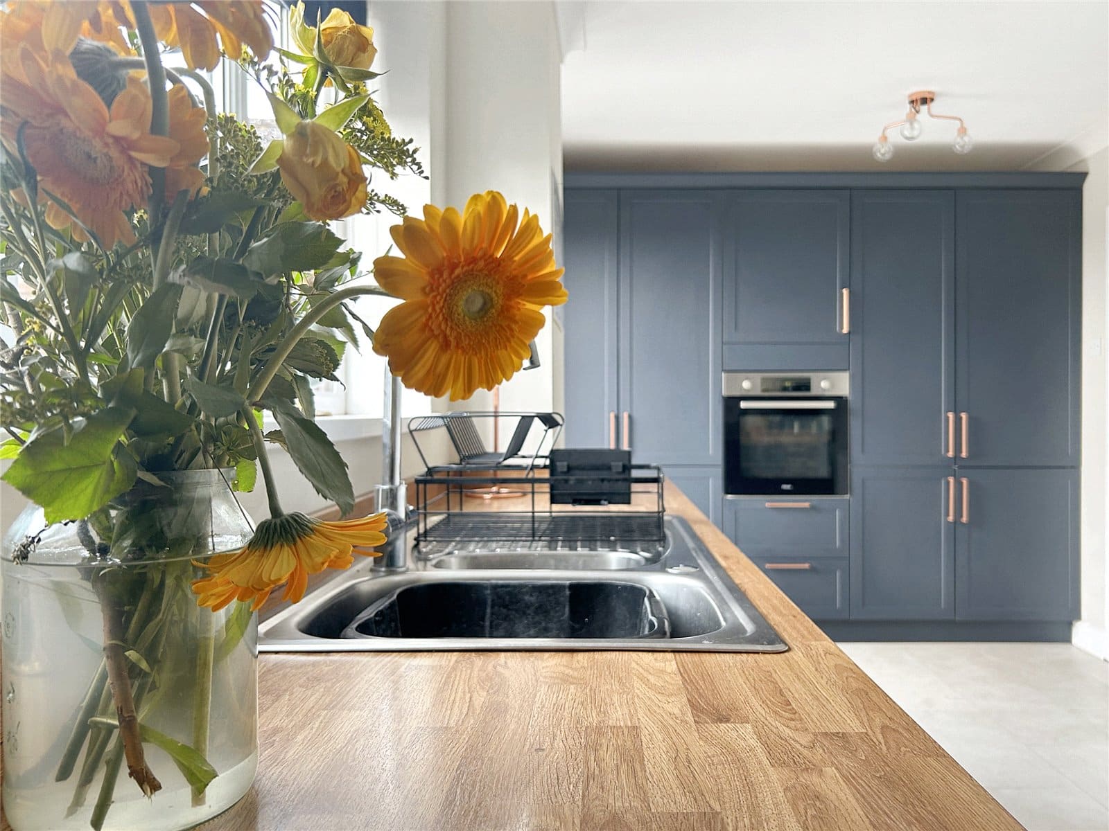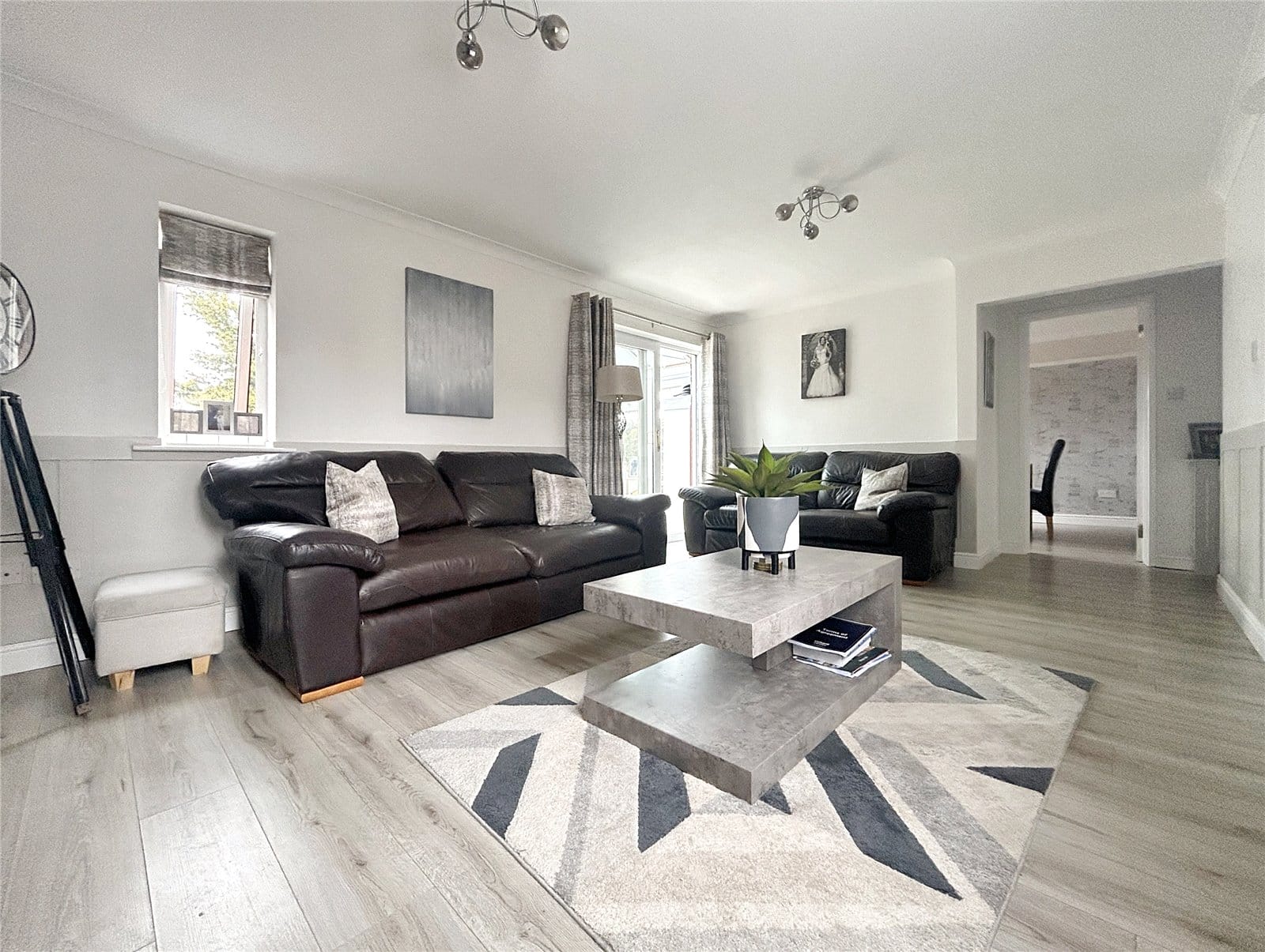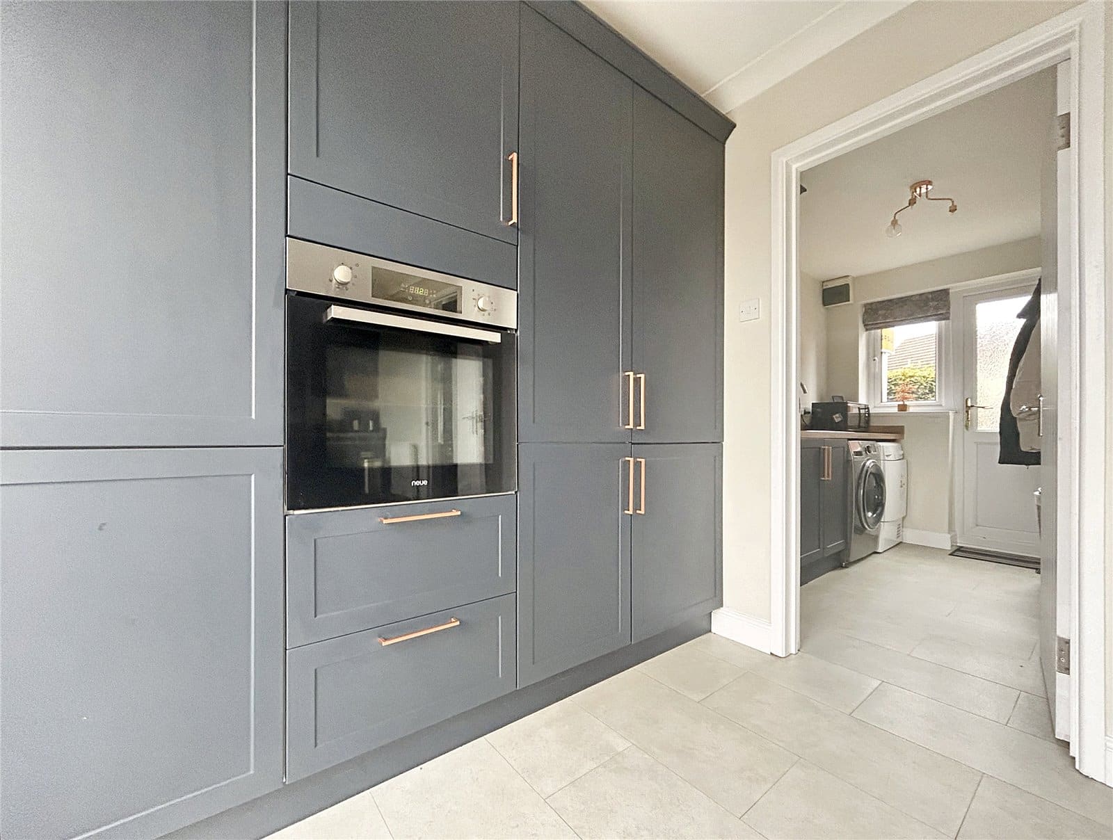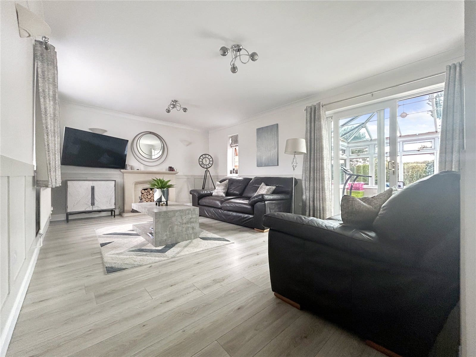 Upon entering the property, you are welcomed by a generous hallway that leads into the main living areas. The living room is a bright and inviting space, with ample room for relaxing and entertaining. Large windows allow natural light to flood in, and a feature fireplace adds a cozy ambiance, perfect for those cooler evenings. French doors open into a well-proportioned conservatory, offering additional space for enjoying the garden views throughout the year. The conservatory could serve as a second sitting room or even a playroom, providing flexibility for growing families.The heart of the home is the newly fitted kitchen, designed with a range of contemporary midnight blue shaker style units. This stunning kitchen boasts ample storage and high-quality integrated appliances, including a built-in oven, hob, dishwasher and fridge-freezer, creating an ideal space for cooking and family dining.