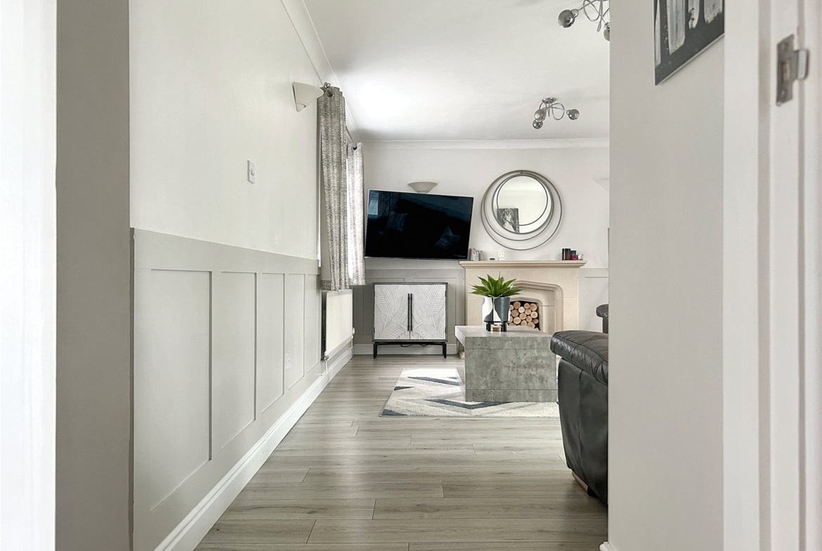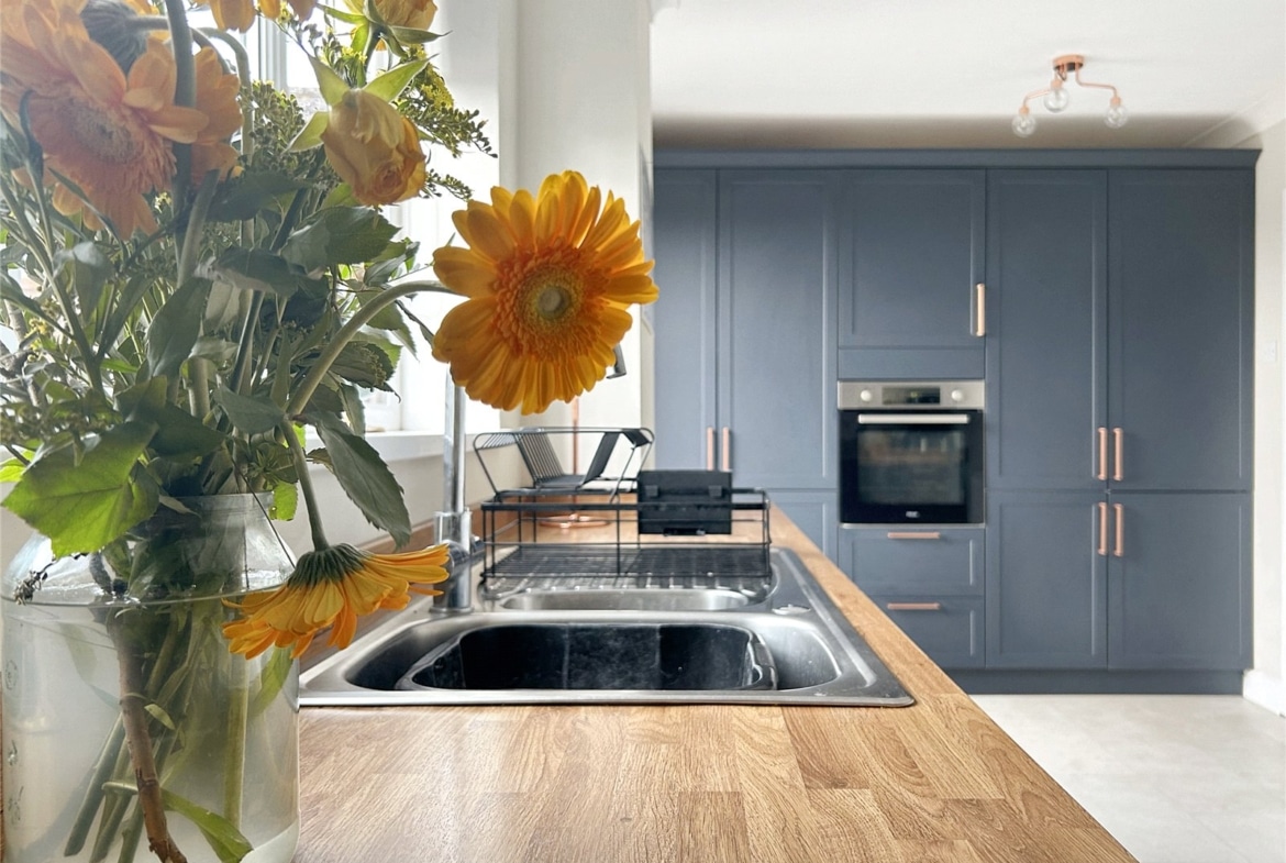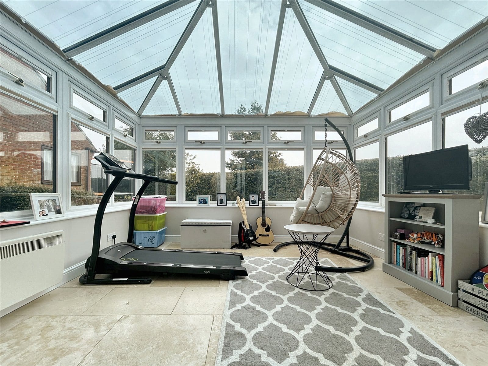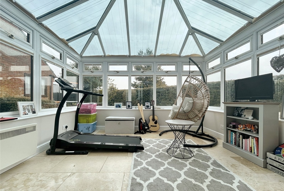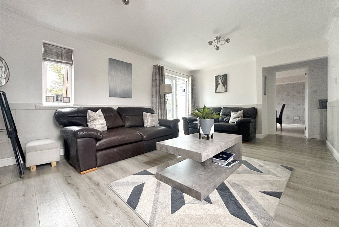 Upon entering the property, you are welcomed by a generous hallway that leads into the main living areas. The living room is a bright and inviting space, with ample room for relaxing and entertaining. Large windows allow natural light to flood in, and a feature fireplace adds a cozy ambiance, perfect for those cooler evenings. French doors open into a well-proportioned conservatory, offering additional space for enjoying the garden views throughout the year. The conservatory could serve as a second sitting room or even a playroom, providing flexibility for growing families.The heart of the home is the newly fitted kitchen, designed with a range of contemporary midnight blue shaker style units. This stunning kitchen boasts ample storage and high-quality integrated appliances, including a built-in oven, hob, dishwasher and fridge-freezer, creating an ideal space for cooking and family dining.